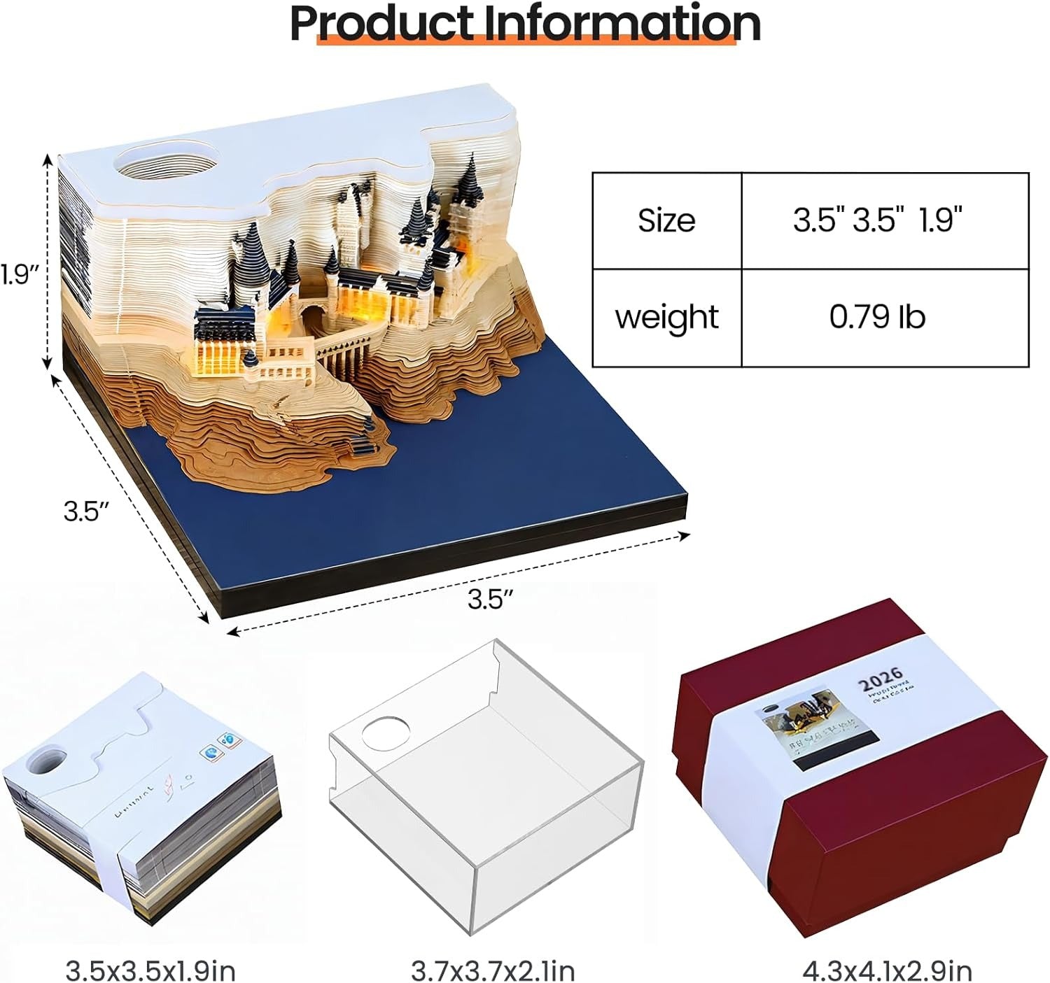 Product Include: Magic Castle 3D Notebook 2026 Week Calendar (170 pages, 52 weeks) * 1; Acrylic box * 1; Exquisite packaging box * 1.
