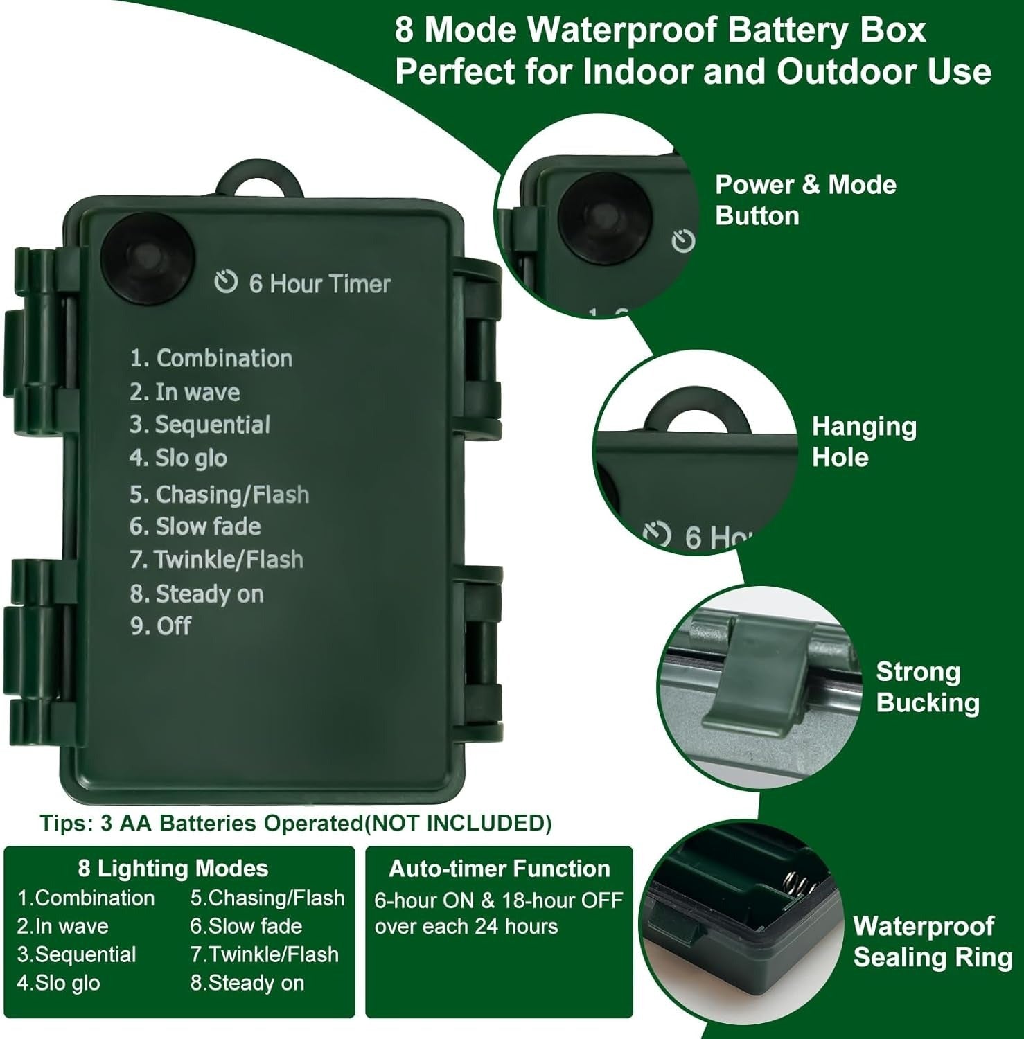 ⏲️8 Lighting Modes and Auto Timer:Press the black button on the battery box to select the mode you want. Combination, In waves, Sequential, Slow Glow, Chasing/Flash, Slow fade, Twinkle/Flash, Steady on. To avoid forgetting to turn off the lights, you can set timer, the fairy lights will be 6 hours on and 18 hours off per day.