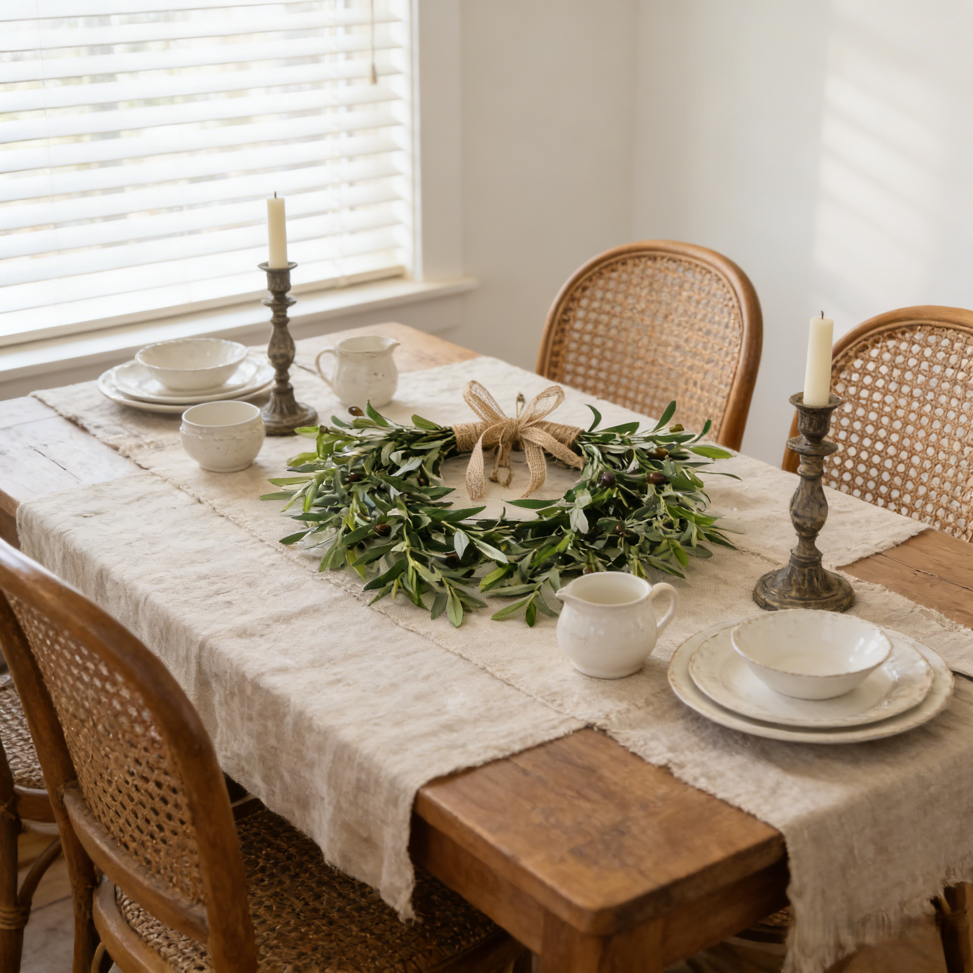 - Material: Artificial greenery (silk & plastic), natural rattan base, burlap bow